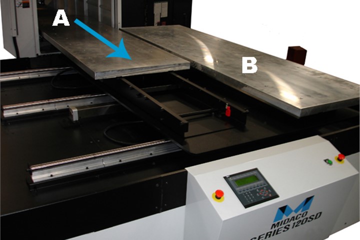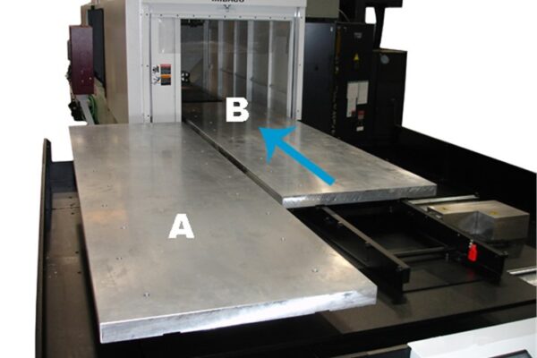 The MIDACO A6030SDY is an Automatic Y-Axis Shift Pallet Changer system designed to maximize machine up-time by facilitating fast, automatic pallet exchange outside the machining envelope. It includes a powerful Series 52A Pneumatic Receiver with a 4-000 lb (1-816 kg) capacity and comes standard with two 60 inch by 30 inch (1-524 mm by 762 mm) cast aluminum pallets, making it an ideal choice for increasing productivity on large Vertical Machining Centers.
