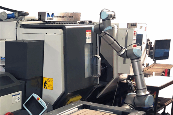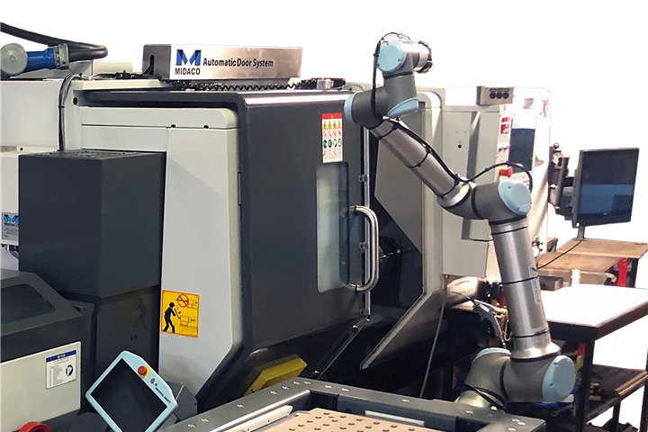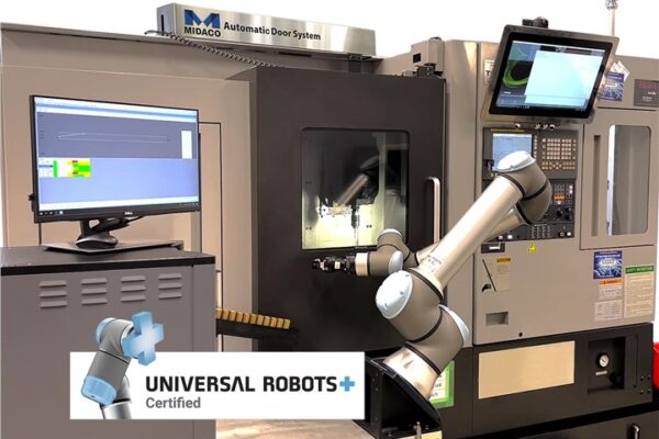 The MIDACO “Robot Ready” AutoDoor for UR Cobot is a Universal Robots+ Certified system designed to automatically open and close doors on CNC machining centers. This essential automation accessory enables the UR Cobot to efficiently load and unload parts, minimizing idle machining time, reducing wear on the Cobot, and significantly increasing productivity in unattended machining processes.