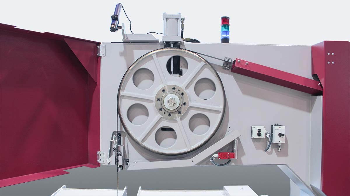 The Behringer LPS120-160-3 is a 3-wheel vertical bandsaw designed for heavy-duty production and precision separation cuts on large aluminum and non-ferrous blocks and plates. It features a robust cast iron construction, a powerful 15 kW main drive, and three band wheels for enhanced stability and extended blade life, enabling high cutting performance up to 1-600 mm (63 inches) width and 1-200 mm (47-2 inches) height.