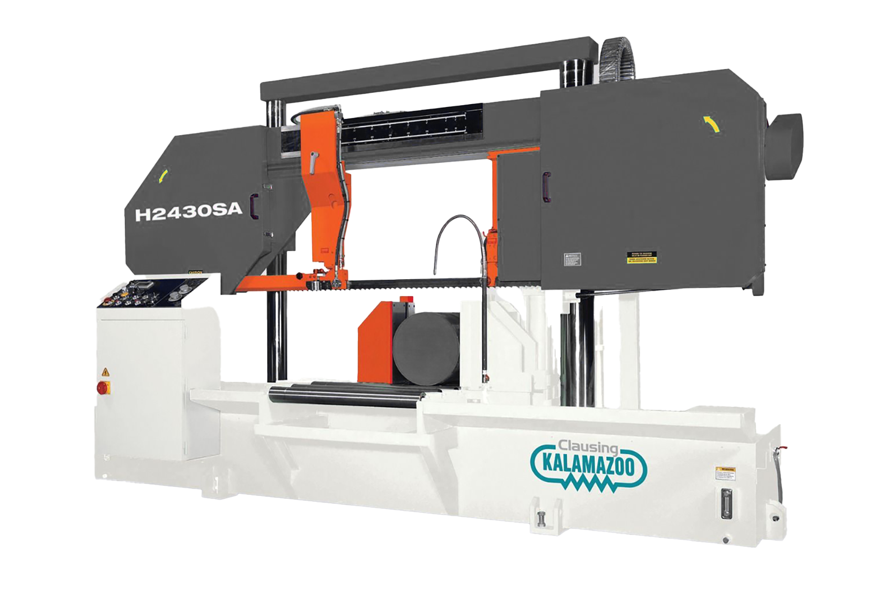 The CLAUSING H2430SA is a Double Column Semi-Automatic Horizontal Bandsaw from Clausing Kalamazoo engineered for high-volume, heavy-duty production applications. Its standout feature is the twin column design with an integrated cross link, which provides enhanced structural strength and rigid support to keep the 2-inch by 0.06-inch by 283-inch blade perfectly parallel and square throughout the cutting cycle.