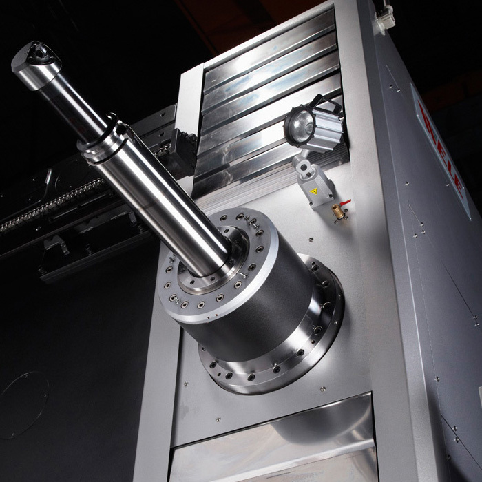 The HB1416 is a horizontal boring mill featuring a solid cast iron base, cylindrical roller guides, and a backlash-free design on the B axis. The robust quill spindle provides stability for heavy-duty cutting, while the unique counterbalance system on the headstock ensures accuracy.